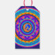 Hand painted artwork inspired by otomi embroidery style decorative patterns. Depicts weimaraner in center of circles and floral patterns along with rabbits running around the outer circles of muli-coloured layers of bright hues on a dark blue background.