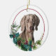 På framsidan av denna Helgdag är ett vackert porträtt av en Weimaraner-hund som pissar ut en holly och en evig grön bough. Röda bär och gräs-koner dekorerar huggen och gräs sprickor. Bilden placeras på en vit cirkel inom en tunn röd linjekrets. Baksidan av dekoratet har samma vergreka och cirkel med röd anpassningsbar.
