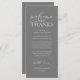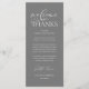 Make a heartfelt first impression at your wedding reception with this sophisticated "Welcome & Thanks" place card—designed to rest beautifully on each guest’s plate, in dark grey theme. Featuring graceful script typography and a timeless layout, this elegant card warmly greets your loved ones while expressing gratitude for sharing your special day. Ideal as a dual-purpose place card & welcome note—combine sentiment and function without cluttering your tables-cape. Designed for couples who value refined details, this card complements modern and luxe wedding themes. Print on premium card stock for a luxurious finish that guests will cherish (or even keep as a sweet keepsake!). Because love is best served with gratitude.