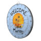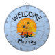 Welcome everyone to the lake with this custom dart board featuring a beautiful sunset over the water on a blue background. Great lake house gift. Personalize with the name of the lake you love.