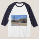 bomullsraglan-sleeve t-skjorta, blått och vit, med fotoet av det kyrkliga "Wellington baptistiska tempelet",