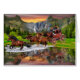 En guld- solnedgång, bergvattenfall och gröna grästräd omger den Wells Fargo diligensen, som dess lag av hästar rusar den över spegelsjön skapar en storartad reflexion för en vilda westernbild.