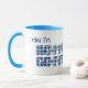 En attraktiv vit ring mugg med blå läppar och handtag och "Jag gillar kaffe" på walesiska". Brev är fyllt med en mönster av Blue and White Check Gingham.