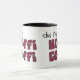 En attraktiv vit ring mugg med svart läppar och handtag och "Jag gillar kaffe" på walesiska". Brev fylls med ett rött och grönt geometriskt mönster. Du kan föredra att ändra bakgrunden färg genom att använda knappen Anpassa och sedan knappen Redigera > Bakgrund.