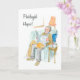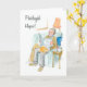 Ett födelsedagskort med hälsning på walesiska och en äldre man som leker med tidningen i företaget med en katt och en hund, från en handmålad illustration av Judy Adamson.