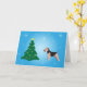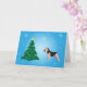 En Welsh Terrier står i profil och tittar på ett julgran dekorerad med lampor och en stjärna. Allt står på en blå gradientbakgrund med enkla gnistrande stjärnor. Insidan lyder, "Njut av säsongens magi!"