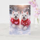 Fira Alla hjärtans dag med dubbel charm i det här hjärtvärmande West Highland White Terrier Alla hjärtans-kortet. Med två glada Westies som springer genom nysnö, iklädda mysiga röda tröjor med rosa hjärtan, fångar designen allt som hundälskare älskar - lekfullhet, lojalitet och ren tillgivenhet.