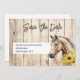 En vacker vattenfärgsmålning av en palomino-/smokey-kräm/champagnehäst med en färgad av perlino-vätetvättad vit träbakgrund som består av lodrät-plankar som har en kolvskog av grått i sig. Hästen tittar till sin höger namn i det gifta sig paret och har blommigt av solblommor av söt gult runt nacke. En vit inläggning innehåller mallar för personligens ordalydelse och baksidan har en vit bakgrund med en annan blomma från ro och en mall för ytterligare information, om så krävs. Ta helt enkelt bort detta om det inte behövs. Dessa är idealiska för en brudens sida eller dusch och är perfekt för ett westernt tema i land bröllop.