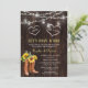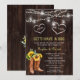 Unik, vintage design med "JAG GÖR, MIG OCKSÅ" typografi inuti två hjärtan, murade krukor strängljus, akvarell cowboy stövlar med solrosor, på en gammal lada. Använd Anpassa verktyg för att lägga till din information. Besök, tack, min Western Country Bröllopssamling.