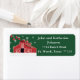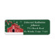 Western Farm Ranch Red Barn Return-adressetikett. Det finns en annan version av denna märkning utan snö och prydnadsföremål.
