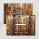 Rustik lantlig träbakgrund med glasburksljus som hänger från strängljus, coolt gammalt trävagnshjul med jutesnöre och gammal västerländsk reprabatt.