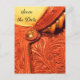 Sätt en avslappnad men ändå klassisk ton för er kommande lantliga bröllopsfest med det rustika och chic Western Saddle Country Bröllop Spara Datumet Annonseringskort. Detta charmiga anpassade ranchtema för bröllop håll datum-kort har en närbildsfotografi av en brun och gul för läder hästsadel med en invecklad blad design. Perfekt inspiration för en informell lada fest ceremoni och mottagningsfirande.