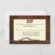 Rustik Western OSA kort för personligt bröllp-respons, med en mörk brun verktygslös läderbakgrund och grafik av en betrodd taggtråd, över grund. Ett grått textområde i färgaden innehåller bilder av ett tittar i det sydda lädret ram och anpassningsbar brunt redo för att anpassa. Underbart tittar bröllop OSA-kort som överensstämmer med vår Westerna inbjudan till vårt passiva läderbröllop.