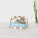 En söt blå och brun cowboyhatt med en gult sheriffbricka tack du kort på en grå vit och brun cowhide spot- och ko-tryckbakgrund och utskriven tejpform på band. Det här tackkortet är perfekt för en land-western eller rodeo-temad babydusch eller födelsedagsfest för en pojke. Art © Chrissy H. Studios, LLC. Alla Höger reserverade.