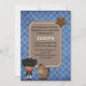 Westerna pojke först födelsedagsfest inbjudan gjorde i blått på blå, nödlidande gingham-checkbakgrund. Ett brunt liknande textområde i en kartong har grafik över en stjärna, barncowboyen och hästen. Anpassa texten till din lilla mans speciella dag.