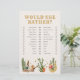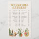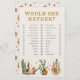 Westernt Boho Möhippa-spel. Få skrattet att börja med det här skulle hon hellre spela möhippa, designad med lekfull cowgirl-energi och illustrerad med vattenfärgsdetaljer som stövlar, hattar och ökenblommigtar. De ärliga neutralterna, , orange- och lyxfärgerna guld och svart står mot ett samordnande Westernt mönster på baksidan. Det är perfektens sätt att bryta isen och fira brudens personlighet. Det här är en gästfavorit!
