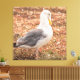 Ett westernt fiskmås står på en strand som är täckt av vegetation och dess huvud vrids på sidan som om det vore att förfina sina fjädrar.