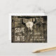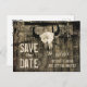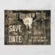 Rustic western bröllop-tjur skalle med horn vintage stil spara datum meddelande vykort. Ranch grunge struktur. Barn wood cowboyen inspirerade. Antique sepia brun bison bra art. Image copyright Marg Seregelyi Photography.
