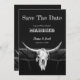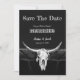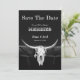 Westerna vintage, antika cowboyen stil. Roligtens svarta och vita bröllop-design sparar datumplatta kort. Rustiska inbjudningar av skallar från nötkreatur. Använda lite humor med detta söta, roliga bondhus stil. Skriptet kan vara personlig. Gammal vilda western, unik. Coola, trendig lantbruksdjur. Upphovsrätt Marg Seregelyi Fotography.