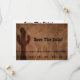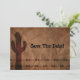 Det Westerna Spara datum meddelande i Land har ett westernt tema som är komplett med Cacti och taggtrådsstängsel. Perfekt för ett western eller landsbyggsbröllop!