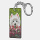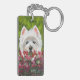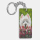 Väster Highland White Terrier och rosa blommor. Westie hund som söker över en blommar bush. Sophie. Copyright © 2025 Angi Laframboise. Konsthantverk i hund aveln till hundälskare.