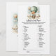 Adventure themed, "What's In Your Purse", baby shower game card with an adorable fox holding a teddy bear riding in a green hot air balloon. The watercolor green sky has white clouds with surrounding gold stars. Templates on back.