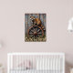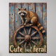 Den här unika målningen fångar upp en tvättbjörn med nyfikna blickar framåt, sitta på ett gammalt vävt trävagnshjul. Hjulet står mot en texturerad trävägg. Gräs och andra växter grots upp kring hjulbasen. Uttrycket "Cute but feral" visas på en framträdande plats i ett lekfullt teckensnitt för gult i grund.