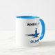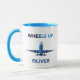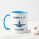 This personalized "Wheels Up" aviation mug features a striking blue-toned commercial airplane in a head-on takeoff silhouette, paired with bold, contemporary typography. It is the perfect gift for commercial pilots, aerospace professionals, or anyone with a passion for modern flight and minimalist design.