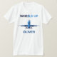 This personalized "Wheels Up" aviation t-shirt features a striking blue-toned commercial airplane in a head-on takeoff silhouette, paired with bold, contemporary typography. It is the perfect gift for commercial pilots, aerospace professionals, or anyone with a passion for modern flight and minimalist design.