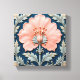 A square tile with a pink flower in the center, surrounded by silver leaves, on a dark blue background, symmetrical composition, intricate details, vintage style, decorative art.