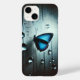 A stunning, vibrant blue butterfly rests with its wings closed on a rain-covered glass surface. Countless water droplets scatter across the wet glass like tiny diamonds. The background is softly blurred, suggesting a misty garden or foggy window. The overall mood is tranquil yet magical, with hyper-realistic details—each droplet and wing scale meticulously rendered.