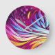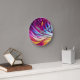 This wall clock, has a colorful design of feathered brush strokes in a slight butterfly design, on a light purple background.