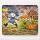 A playful autumn farm illustration featuring a smiling blue plaid scarecrow holding a leaf, with a pumpkin, sunflower, owl on a fence, red windmill barn, golden trees, and drifting fall leaves under a colorful sky.