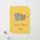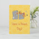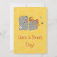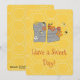 Ett livfullt, handillustrerat välkomstkort med en charmig grå bihåla täckt av surrande bin och ljusa orange blommor. Mot en solig gul bikakebakgrund har detta kort det lekfulla ordleken "Ha en söt dag!" i en vänlig, handskriven stil. Perfekt för en söt födelsedag eller en morgonuppiggare, ett glatt meddelande till en nära och kära eller ett nyckfullt "bara för att"-kort. Orden kan anpassas.