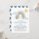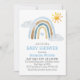 Denna drömlika vattenfärg-inbjudan till baby shower designades för att ge glädje och värme till din fest! Inspirerad av mjuka himlar och lätt regn, skapar den handmålade regnbågen med fluffiga moln och en strålande sol en mysig, könsneutral tema.