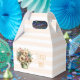 En liten favör låda med en söt bild. Blå, rosa och krämfärgade blommor med gröna blad. Satt i en grön blomkruka med en grön rutig duk som hänger över kanten.