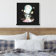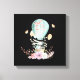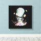 A canvas print with a charming illustration of a little bunny riding along in a hot-air balloon decorated with a fancy pink ribbon, along with some flowers and butterflies.