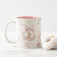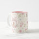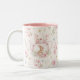 Whimsical Bunny Teapot Floral Spring Two-Tone Coffee Mug. This design features a delightful whimsical bunny nestled within a pink teapot, surrounded by spring blossoms and green foliage. This floral pattern brings a touch of spring magic to your everyday sips. Perfect for tea, coffee, or hot cocoa, it makes a delightful gift for Easter, Mother's Day, birthdays, or any occasion for a bunny lover.