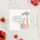 These Whimsical Calligraphy Graduation Bow Napkins features a beautiful, hand-painted watercolor sketch of a graduate from a back-view perspective. The design highlights a stylish black mortarboard adorned with a delicate border of white pearls and a stunning, oversized fabric bow with long, flowing tails. To complete the look, the graduate holds a lush bouquet of creamy white roses.