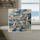This vibrant coastal tile design features a lively mosaic-style school of fish swimming through swirling waves of teal, aqua, navy, and sandy beige. Each fish is detailed with warm tones of coral red, sunlit gold, sea-glass green, and pearly white, accented by whimsical spirals and stylized curves. Crescent moon shapes drift among the fish, giving the piece a playful sense of rhythm and motion. The layered textures and bold color contrasts create an energetic, artistic look that brings a bright, modern coastal spirit to any décor theme. Note: design may contain generative content
