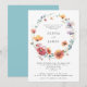 This design features a delicate watercolor wreath made of wildflowers in shades of blue, red, orange, violet, and gold. Perfect for spring and summer outdoor engagement parties.