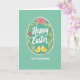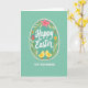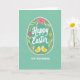 This greeting card features a calm teal background with an egg-shaped window outlined by a pale border at the center. Inside the egg, the words “Happy Easter” appear in flowing white lettering, placed high enough to leave room for the illustration below. Around the egg, pink and yellow flowers with soft green leaves curl along the edge like a spring wreath 🌷. At the bottom of the egg sit two small yellow chicks, their rounded bodies close together and their orange beaks nearly touching in a sweet, friendly moment 🐰. Beneath the central design, “TO MY DEAR GRANDSON” is set in simple white uppercase letters, centered and easy to read. The mix of teal, sunny yellow, and gentle pink keeps the scene light and affectionate without feeling busy. Small blossoms and leafy sprigs cluster most densely along the sides of the egg, with a few petals pointing outward from the border.