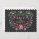 Denna livfulla fiesta-inspirerade Spara Datum-kortdesign har en fantasifull och invecklad mexikansk blomsterdesign i varmt rosa, lila, orange, grönt, gult och turkos på en mörk kolbakgrund. Använd mallfälten för att lägga till dina detaljer. Klicka på "Anpassa ytterligare"-knappen för att ändra elementens ordning om det behövs.