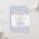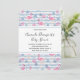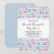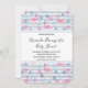 Bebis shower inbjudan ett mönster med en rolig sommarstämning. Rosa flamingos och ananas på ett ljust blått randigt mönster med blad och hjärtan runt omkring.