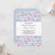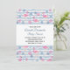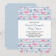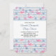 Bebis shower inbjudan ett mönster med en rolig sommarstämning. Rosa flamingos och ananaser på ett ljust blått randigt mönster med blad och hjärtan runt omkring.