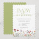 Celebrate the upcoming arrival of your little one with this whimsical floral Baby in Bloom Baby Shower Invitation. This simple invitation captures the essence of nature's charm with beautiful watercolor flowers in soft, pastel hues with a green highlight and white background. The elegant script calligraphy adds an elegant touch, along with a scalloped frame, perfectly complementing the chic baby in bloom theme. This wildflower gender neutral baby shower invitation embodies the spirit of nature, inviting guests to join in a joyful celebration during spring or summer.