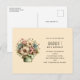 Birthday party invitation postcard with a cute image. Blue. pink and cream colored flowers with green leaves. Set inside a green flower pot with a green plaid cloth hanging over the side.