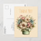 Thank you postcard with a cute image. Blue. pink and cream colored flowers with green leaves. Set inside a green flower pot with a green plaid cloth hanging over the side.