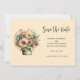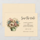 Save the date card with a cute image. Blue. pink and cream colored flowers with green leaves. Set inside a green flower pot with a green plaid cloth hanging over the side.