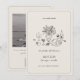 Tillkännage ditt bröllop med ett lekfullt, fantasifullt spara-datum som presenterar sällsamma handritade klotter av vin, charcuterie och blommor. Med en coquette fransk estetik, funky klotter och personliga detaljer som ett foto, QR-kod och monogram på baksidan är detta kreativa kort perfekt för par som söker en rolig och unik bröllopsinbjudan.